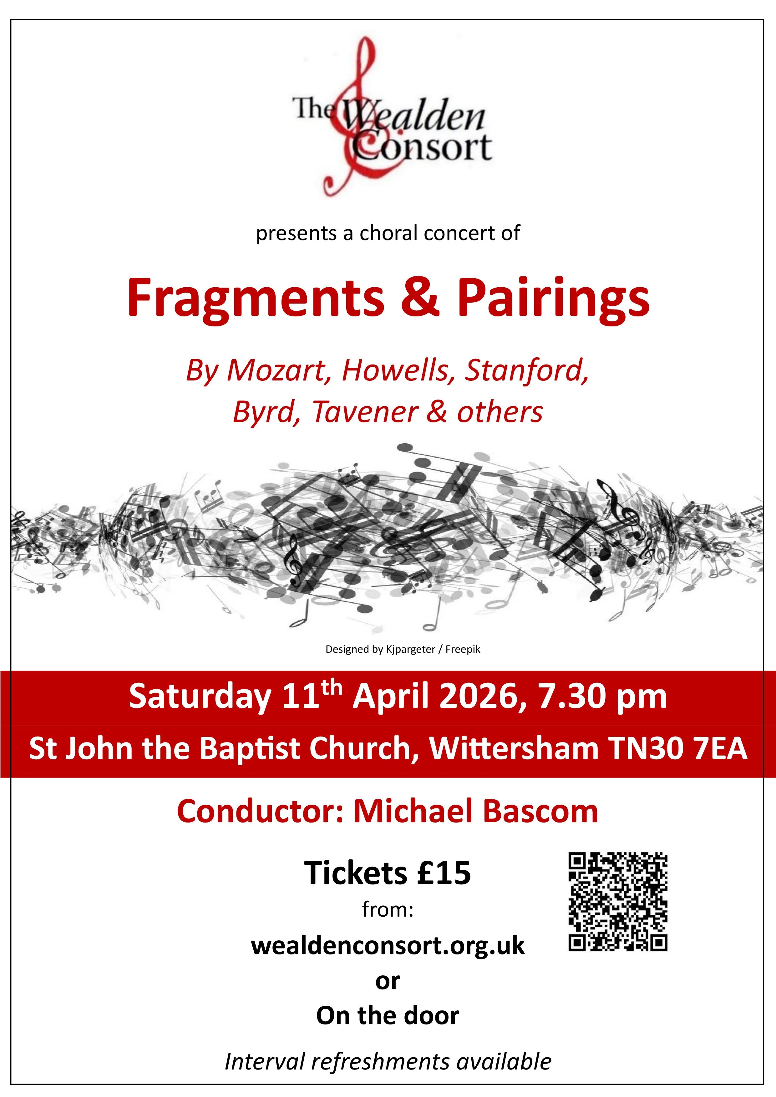 The Wealden Consort is a friendly, enthusiastic and accomplished chamber choir that comes together to make music of a high standard. The Consort performs a wide repertoire, both sacred and secular, ancient and modern, throughout Kent, Sussex and also further afield.